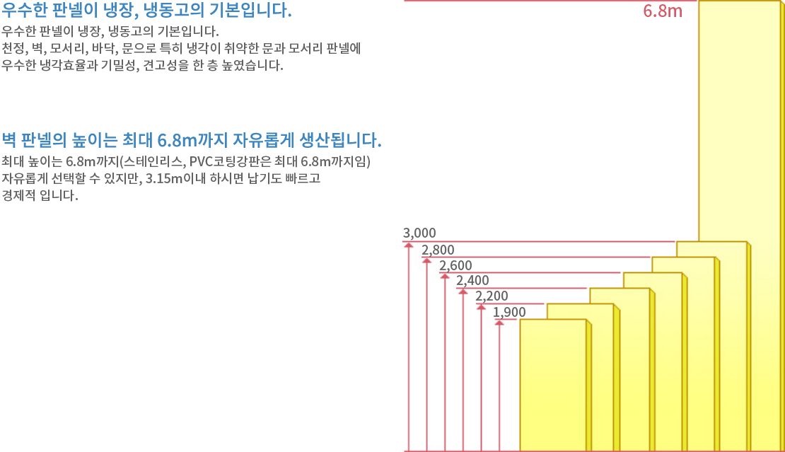축조식에 비해 벽두께가 1/2이하로 우수한 단열성능을 지닌 판넬을 사용합니다.